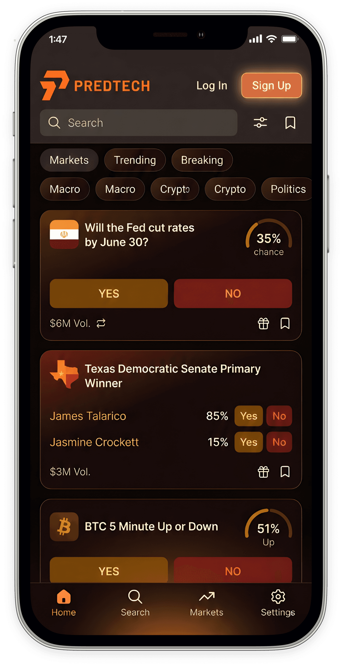 Modo “Live”: mercados destacados, updates em tempo real e audiência.